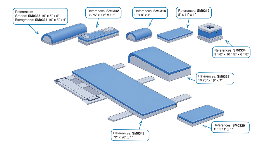 • With or without (1) double-layer prone positioning wedge, size: 48.89 cm x 45.72 cm x 17.78 cm (19.25” x 18” x 7”). Ref: SM0335.