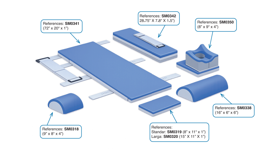 • One body positioning pad, size: 182.88 cm x 50.8 cm x 2.54 cm (72” x 20” x 1”), with or without full arm protectors. Ref: SM0341.